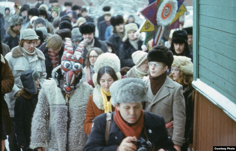 Каляды ў Заслаўі, 1982 год. Сяржук у цэнтры ў масцы казы.