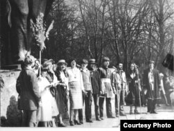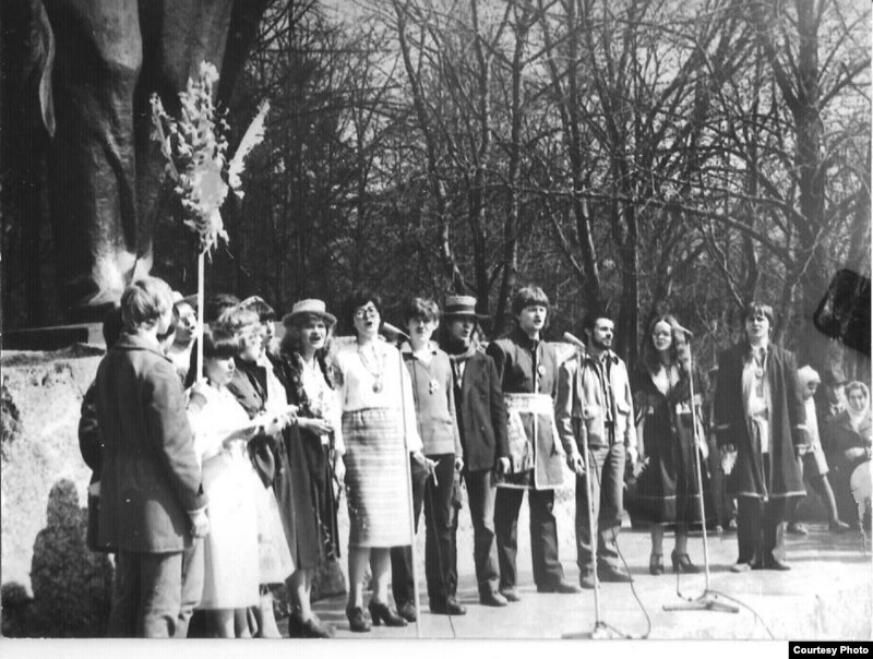 Гуканьне вясны 1983 году. Майстроўня сьпявае каля помніка Янку Купалу. Сяржук Цімохаў трэці справа.