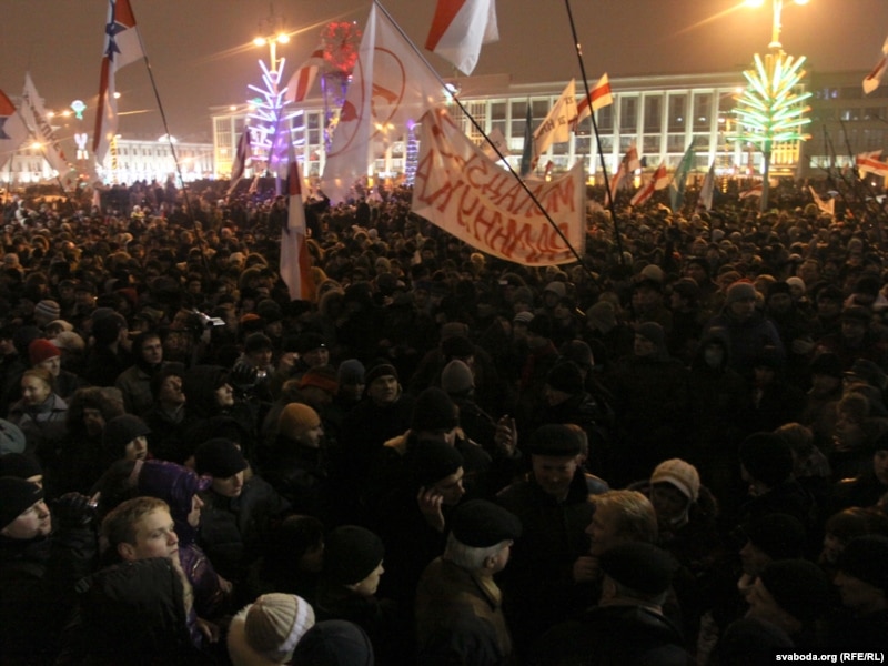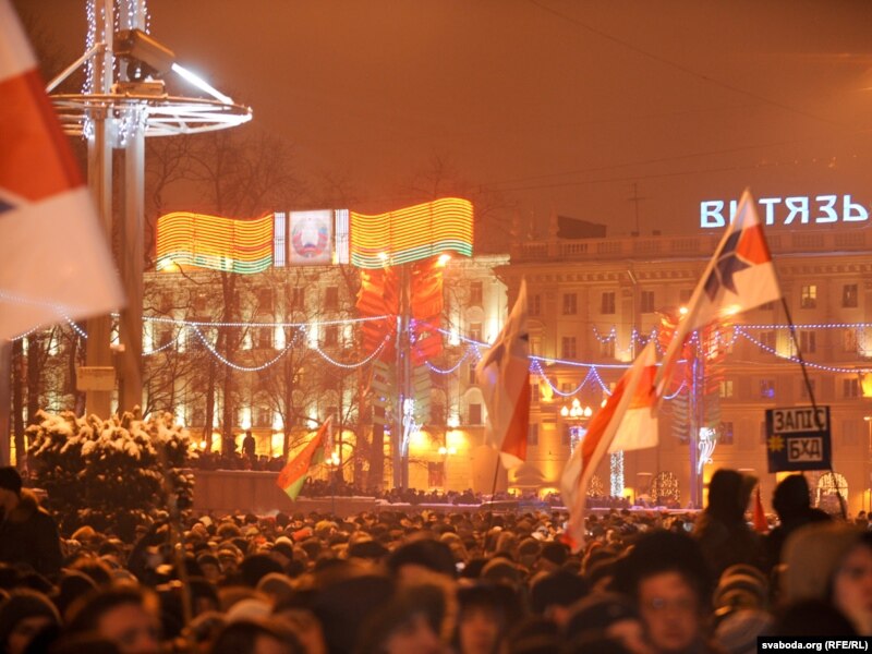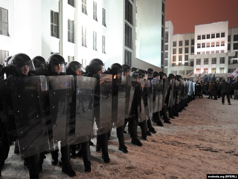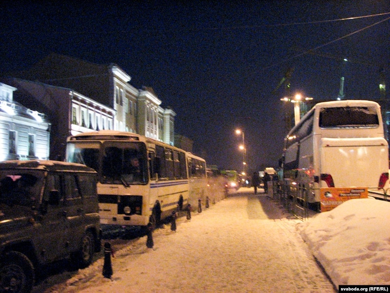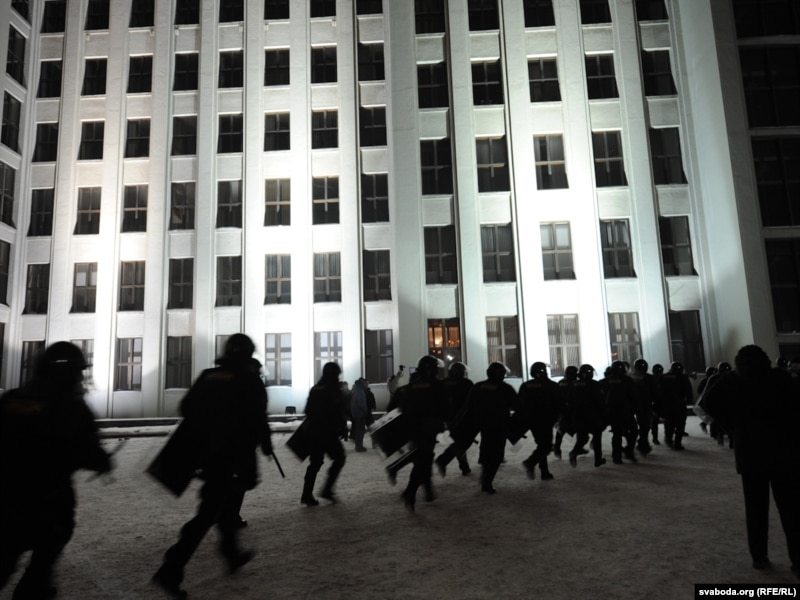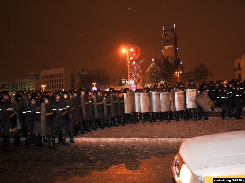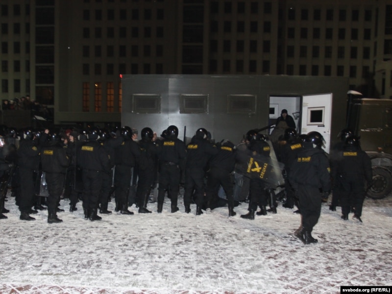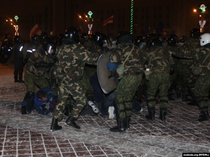23.20 Перадае Галіна Абакунчык: “Спэцназаўцы вельмі жорстка зьбівалі людзей. Жанчын зьбівалі нагамі. У аўтазакі загружалі шмат людзей. На заклік кандыдатаў на прэзыдэнта правесьці перамовы з прадстаўнікамі міліцыі ніхто не адклікнуўся. На плошчы знаходзяцца пераважна спэцназаўцы. Яны перамяшчаюцца па плошчы. Яны спрабуюць дагнаць людзей, расьсекчы натоўп. Трывожны настрой. Людзі шыхтамі бягуць у боку Чырвонага касьцёлу. Ідзе зачыстка плошчы. Застаўся з дзясятак журналістаў на плошчы Незалежнасьці. Усе астатнія людзі выціснутыя з плошчы”.