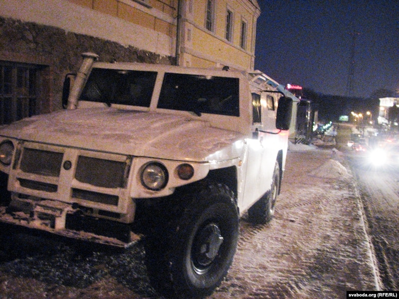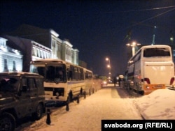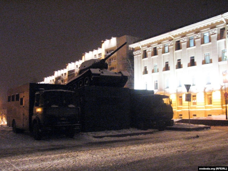 Ля плошчы танк, побач зь ім два аўтазакі. Вакол плошчы некалькі дзясяткаў аўтазакаў, аўтубосы са спэцназаўцамі, эвакуатары. Міліцыя эвакуіруе аўтамабілі са стаянкі.