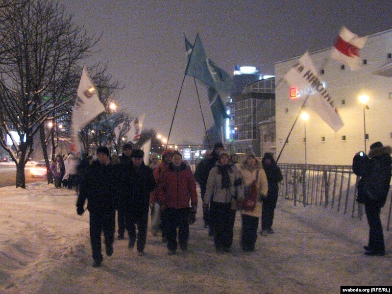 Андрэй Дзьмітрыеў, кіраўнік штабу Ўладзімера Някляева, заклікаў прыхільнікаў жорстка зьбітага кандыдата ў прэзыдэнты сабрацца і прайсьці шлях да Кастрычніцкай плошчы. Гадзіну таму група з паўсотні чалавек учыніла напад на калёну, у якой рушылі Ўладзімер Някляеў і Мікола Статкевіч, і пачала брутальна зьбіваць удзельнікаў шэсьця. Някляеў страціў прытомнасьць і цяпер шпіталізаваны.