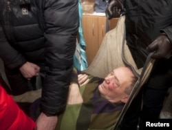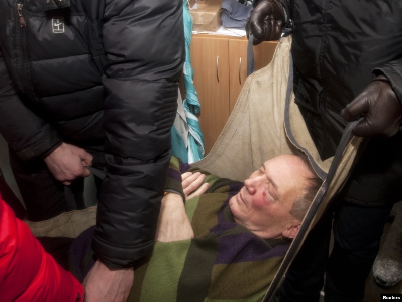 Сем чалавек у цывільным вынесьлі Някляева з палаты.