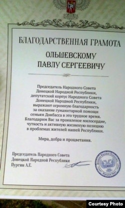 — Гэта мы атрымалі за дастаўку грузу ў Горлаўку. Горлаўку тады моцна абстрэльвалі, а ў нас было 16 пасылак, і хлопцы з аднаго падразьдзяленьня наважыліся дапамагчы. Мы туды паехалі, а ў той момант Горлаўку інспэктавалі лідэры «ДНР» — і Захарчанка, і Пургін, і іншыя. Нас прадставілі, нам падзякавалі. А калі прыехалі наступным разам, нас запрасілі на размову і ўручылі грамату.