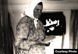 Бацька, маці, брат Павал на парозе пасьляваеннай хаты