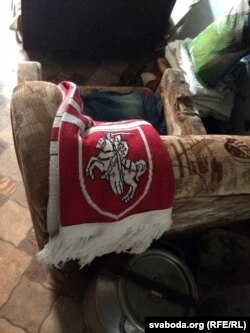 — Сам шалік — ня мой. Тут у мяне кватарант жыў, гэта яго шалік застаўся. Але мне заўсёды падабаўся стары наш беларускі сьцяг. Вось гэты (чырвона-зялёны. — РС), савецкі — ён мне ня вельмі. Не, ну ёсьць такі сьцяг — няхай, калі ніхто ня супраць. Але бел-чырвона-белы сьцяг, «Пагоня», ВКЛ — мне больш па душы.