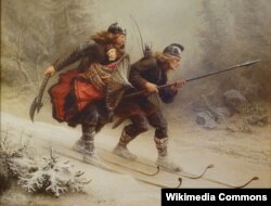Кнуд Бэргсьлін, «Біркебэйны на лыжах перавозяць будучага караля Хокана Хокансана праз горы Філеф’ель у Тронхейм» (1869); Knud Bergslien, «Birkebeinerne på ski over Filefjell fører Håkan Håkansson som barn til Trondheim»