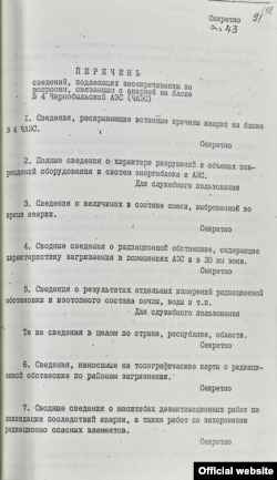 Пра аварыю на Чарнобылскай АЭС грамадзяне СССР даведаліся з афіцыйнага паведамленьня толькі ў пачатку траўня 1986 — пасьля жыхароў дэмакратычных краінаў Эўропы. Праз два месяцы, у ліпені, КДБ СССР засакрэціў практычна ўсе зьвесткі, датычныя аварыі, у тым ліку і ўзровень радыёактыўнай забруджанасьці тэрыторыі і прадуктаў харчаваньня.
