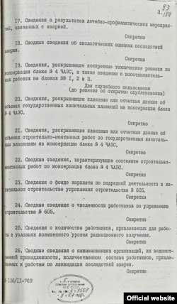 ПЕРЕЧЕНЬ сведений, подлежащих засекречиванию по вопросам, связанным с аварией на блоке № 4 Чернобыльской АЭС (ЧАЭС).