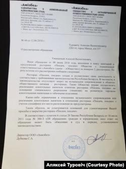 У лісьце, атрыманым ім 20 чэрвеня ад дырэктаркі ААТ «Амізбел» Сьвятланы Дубковай, зазначана, што рэстарацыя створаная і дзейнічае законна, закрываюцца ня мае намеру, таксама як абмяжоўваць продаж алькаголю і музычнага суправаджэньня.