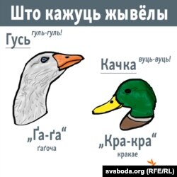 Падзываць гусь (калі яна жаночага роду) або гусака (мужчынскага) таксама можна па-рознаму. Толькі асьцярожна: шчыпаюцца. Агульнабеларускі варыянт — „гуль-гуль“, але людзі кажуць, віленская гусь адгукаецца на „зю-зю-зю“, ад Клецку да Клімавічаў і ад Полацку да Брагіна — на „це-це-це“, заходняя гусь — на „гусь-гусь“, браслаўская — на „жуль-жуль“. У адказ (калі не шчыпаецца) гусь ґаґоча, кажа „ґа-ґа“ (як тая ледзі, праз выбухны Ґ).