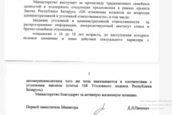У ім гаворыцца, што Міністэрства аховы здароўя «выступае за прапаганду традыцыйных сямейных каштоўнасьцяў і падтрымала наступныя прапановы ў межах праекту закону „Аб зьменах кодэксаў у пытаньнях адміністрацыйнай і крымінальнай адказнасьці“, у тым ліку ўвядзеньне крымінальнай і адміністрацыйнай адказнасьці за распаўсюджваньне інфармацыі, якая дыскрэдытуе інстытут сямʼі і шлюбна-сямейныя адносіны. А таксама выступае за падвышэньне з 16 да 18 гадоў узросту, да наступленьня якога палавыя зносіны і іншыя дзеяньні сэксуальнага характару зь непаўналетнім таго ж полу караюцца ў адпаведнасьці з крымінальным заканадаўствам (артыкул 168)».