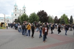 Жыхары Горадні 29 траўня выстраіліся ў чаргу, каб пакінуць подпіс за Сьвятлану Ціханоўскую, якая вылучаецца кандыдатам на прэзыдэнта.