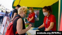 «Даруйце, калі ласка, калі мы з садка, нам сказалі сюды падыйсьці з подпісамі, не падкажаце, у якую палатку?», — запыталася маладая жанчына ў Сьвятланы Вараніцы.