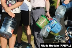 Адна зь іх выстраілася да крыніцы непадалёк ад скрыжаваньня вуліц Лабанка і Гарэцкага. Людзей тут звыш 200. Большасьць з плястыкавымі бутлямі на 5–6 літраў, але ёсьць і са звычайнымі вёдрамі.