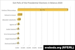 Паводле дадзеных Цэнтральнай выбарчай камісіі, агулам па краіне Лукашэнка мае каля 80%, а Ціханоўская — каля 10%