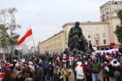 15.49 «Марш пэнсіянэраў і студэнтаў» дайшоў да плошчы Якуба Коласа. Тут удзельнікі акцыі разгарнулі вялікі бел-чырвона-белы сьцяг.