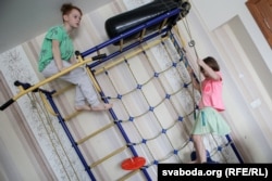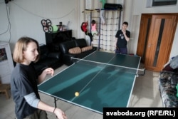 Старэйшыя сыны ў вялікай залі расклалі тэнісны стол. Меншыя тым часам робяць акрабатычныя этуды на швэдзкай сьценцы.