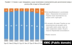 Пяройдзем цяпер да вынікаў вывучэньня грамадзкай думкі ва Ўкраіне. Наступны графік, на якім прадстаўленыя вынікі апытаньняў Кіеўскага міжнароднага інстытуту сацыялёгіі (КМІС), паказвае, што грамадзкая думка Ўкраіны на працягу вайны адмоўна ставілася да магчымасьці тэрытарыяльных саступак.