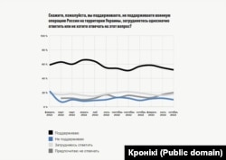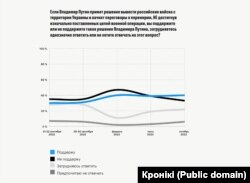 Апытаньні, праведзеныя праектам «Хронікі», давалі больш сьціплыя лічбы падтрымкі дзеяньняў расейскіх войскаў, у іх можна ўбачыць тэндэнцыю зьніжэньня падтрымкі. Аднак і паводле гэтага цэнтру такая падтрымка застаецца высокай.