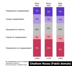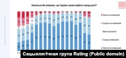 У верасьнёўскім 2023 году апытаньні Rating большасьць рэспандэнтаў (68%) выказвалі ўпэўненасьць, што ў выніку заканчэньня вайны Ўкраіна захавае ўсе тэрыторыі, якія мела ў 1991 годзе.