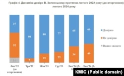 Графік 8. Дынаміка даверу У. Зяленскаму на працягу лютага 2022 году (да ўварваньня) — лютага 2024 году