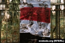 Вось бел-чырвона-белы сьцяг, кінуты на зямлю, з адбіткамі падэшваў. Мне тут бачыцца яшчэ і іншы сэнс, чым на першы погляд. Гэта ня толькі зьдзек з нацыянальных сымбаляў, што магло б быць сьведчаньнем тупой злосьці карнікаў. Адбіткі могуць належаць тым нявінным ахвярам, якіх карнікі заганялі ў аўтазакі і турмы, наўмысна сьцелючы на падлогу ў праходзе бел-чырвона-белы сьцяг, каб ахвяры самі мусілі наступаць на свае сьвятыні. А гэта ўжо зьдзек ня з сымбаляў, а з жывых людзей. На памяць прыходзяць згадкі палітычных зьняволеных лукашэнкаўскай турмы. Адна жанчына кажа, што старалася ісьці па чырвонай паласе, каб адбіткі падэшваў былі не такія прыкметныя, як на белых палосах. А другая, прайшоўшы, сказала сяброўкам: «Сьцяг нам ножкі сагрэў»...