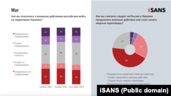 Для параўнаньня, у Расеі падтрымлівае дзеяньні расейскіх войскаў 78% (15% не падтрымліваюць). За мірныя перамовы выступае 66% расейцаў. За працяг вайны — 27%, паводле апытаньня «Левада-центра».