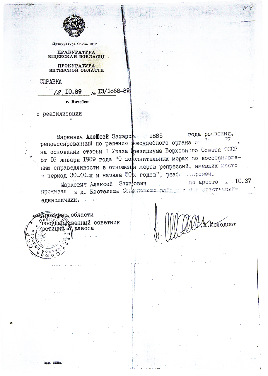 А потым Аркадзь, родны дзядзька Дзіны Пракопаўны, атрымаў адказ зь Віцебскага КДБ. У ім гаварылася, што Аляксея Маркевіча расстралялі ў 1937 годзе ў Воршы. У 1989-м яго пасьмяротна рэабілітавалі.