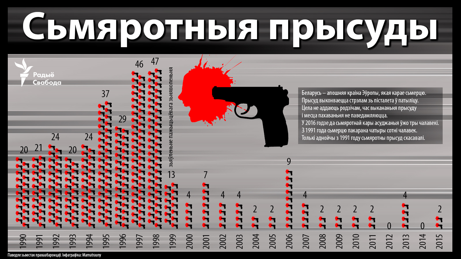 «Дакладная лічба пакараных сьмерцю ў Беларусі застаецца невядомай. Дзякуючы нястомнай працы праваабаронцаў і журналістаў беларускае грамадзтва і міжнародная супольнасьць усё ж валодаюць некаторай інфармацыяй аб прывядзеньні ў выкананьне сьмяротных прысудаў. Паводле зьвестак зь Міністэрства юстыцыі Рэспублікі Беларусь, у пэрыяд з 1994 па 2014 год былі асуджаныя да сьмяротнай кары 245 чалавек. Праваабаронцы лічаць, што з моманту здабыцьця незалежнасьці ў 1991 годзе і да сёньняшняга дня лічба пакараных сьмерцю ў краіне складае каля 400 чалавек».
